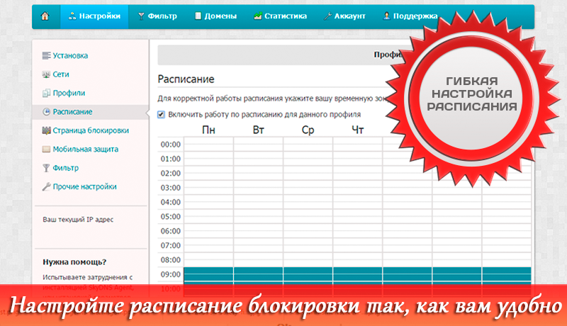 Позволяет задать разные параметры фильтрации по времени. Помогает, когда за одним компьютерам работают дети, которые учатся в разные смены. - Блокировка интернет-рекламы