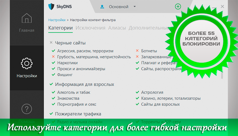 Фильтр централизованно управляется через удобный и интуитивно понятный web-интерфейс или через специальную программу SkyDNS Агент. - Настройка нескольких профилей фильтрации